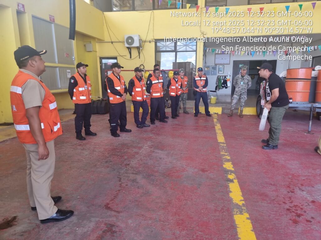 Citado simulacro, se llevó a cabo con personal del Sector Naval de Champotón, del Centro de Adiestramiento Especializado de Infantería de Marina, de la Base Aeronaval de Campeche y Escuadrón Aeronaval 321, en coordinación y supervisión del Grupo de Salvamento y Extinción de Incendio (SEI) del Aeropuerto Internacional de Campeche, Campeche.