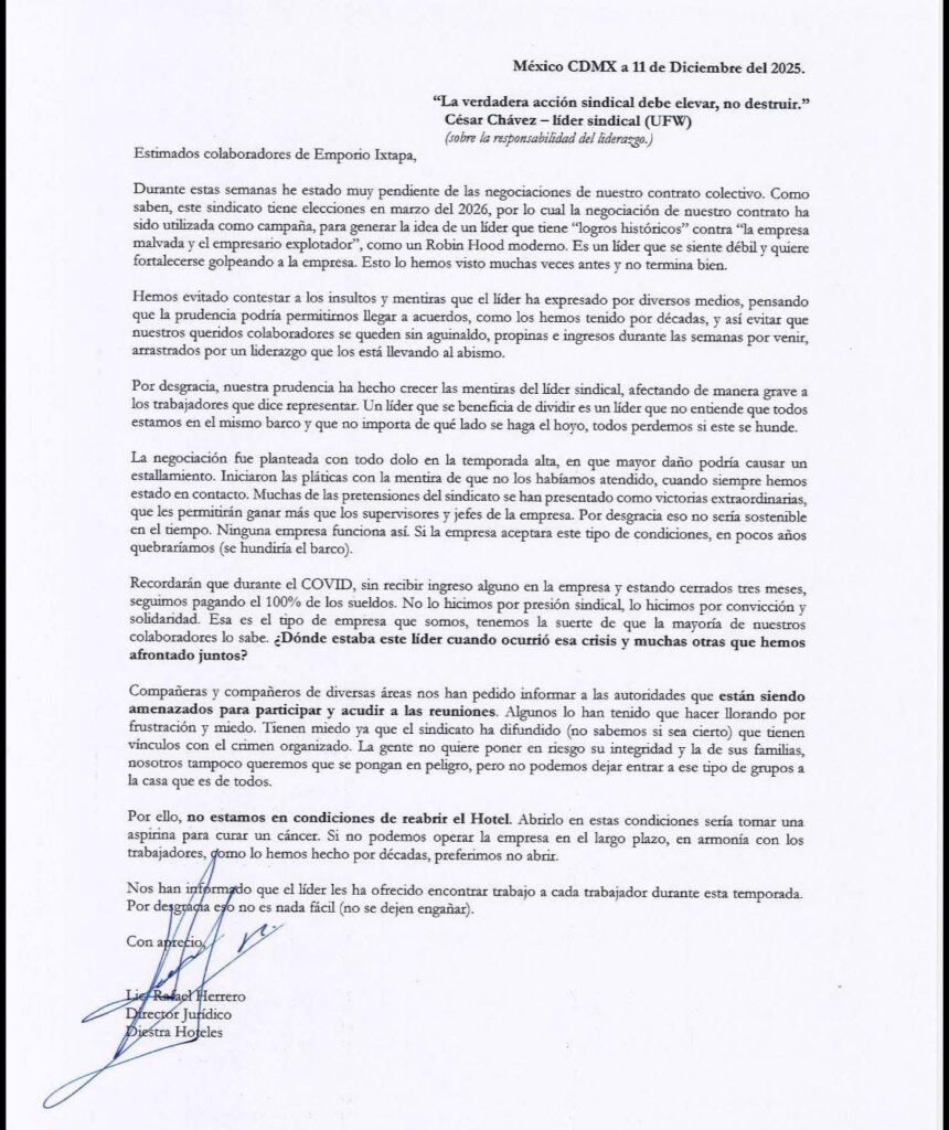 Zihuatanejo, Gro; 11 de diciembre de 2025.- Más de 100 trabajadores del hotel Emporio Ixtapa, desmintieron un comunicado difundido de manera extraoficial, atribuido a un supuesto representante del hotel, en el que se afirma que los empleados fueron amenazados y obligados a participar en la huelga que inició el pasado domingo.
