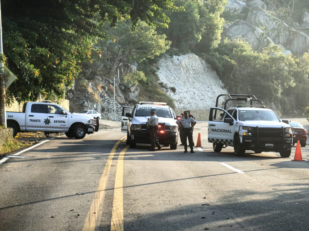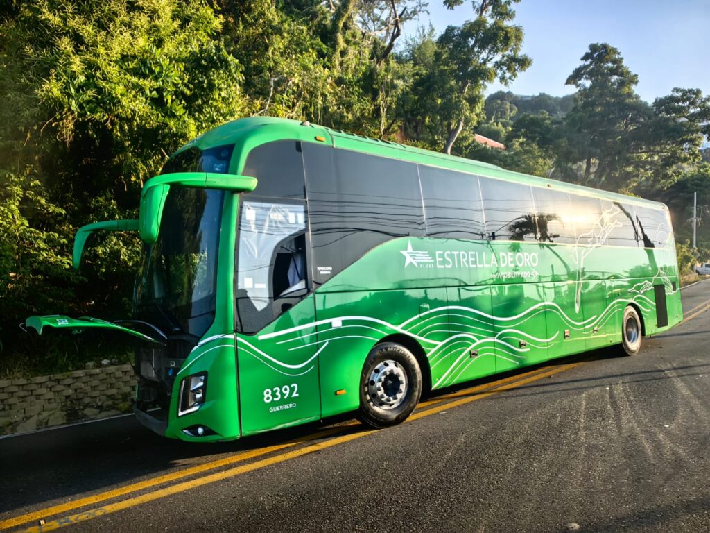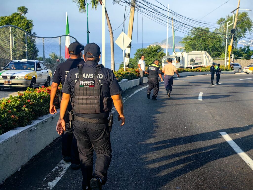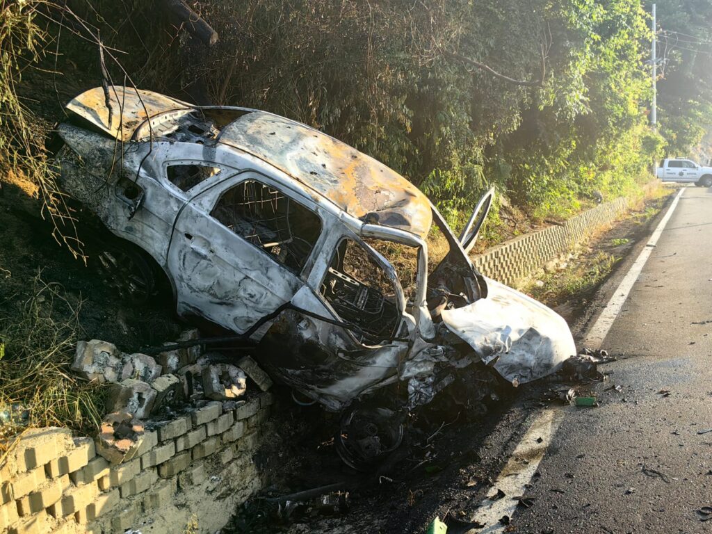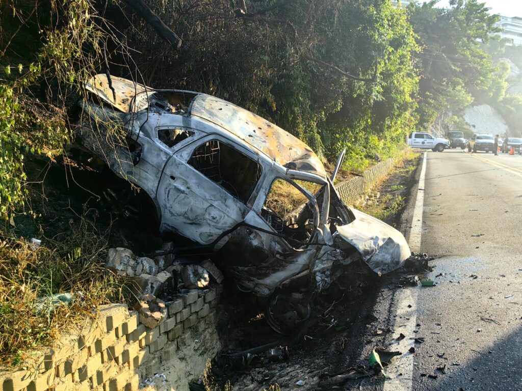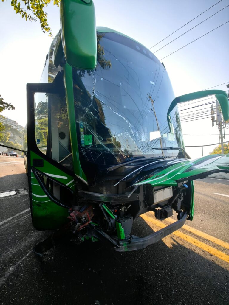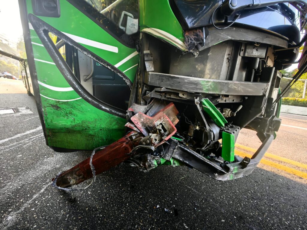 Acapulco, Gro.— Un fuerte accidente registrado la mañana de este lunes en la avenida Escénica de Acapulco dejó como saldo un vehículo particular completamente calcinado y un autobús de la línea Estrella de Oro con daños en su parte frontal.