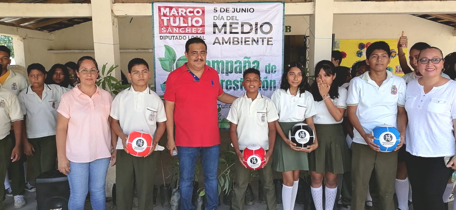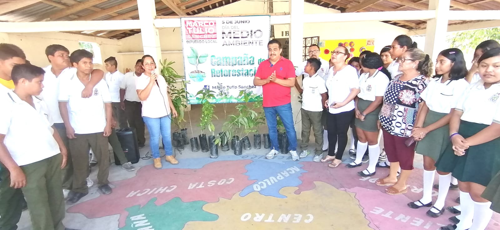 Acapulco, Gro., 05 de junio de 2023.- El diputado local Marco Tulio Sánchez Alarcón, encabezó la celebración por el Día Mundial del Medio Ambiente en la telesecundaria Juan Ruiz de Alarcón, ubicada en la colonia Fuerza Aérea.