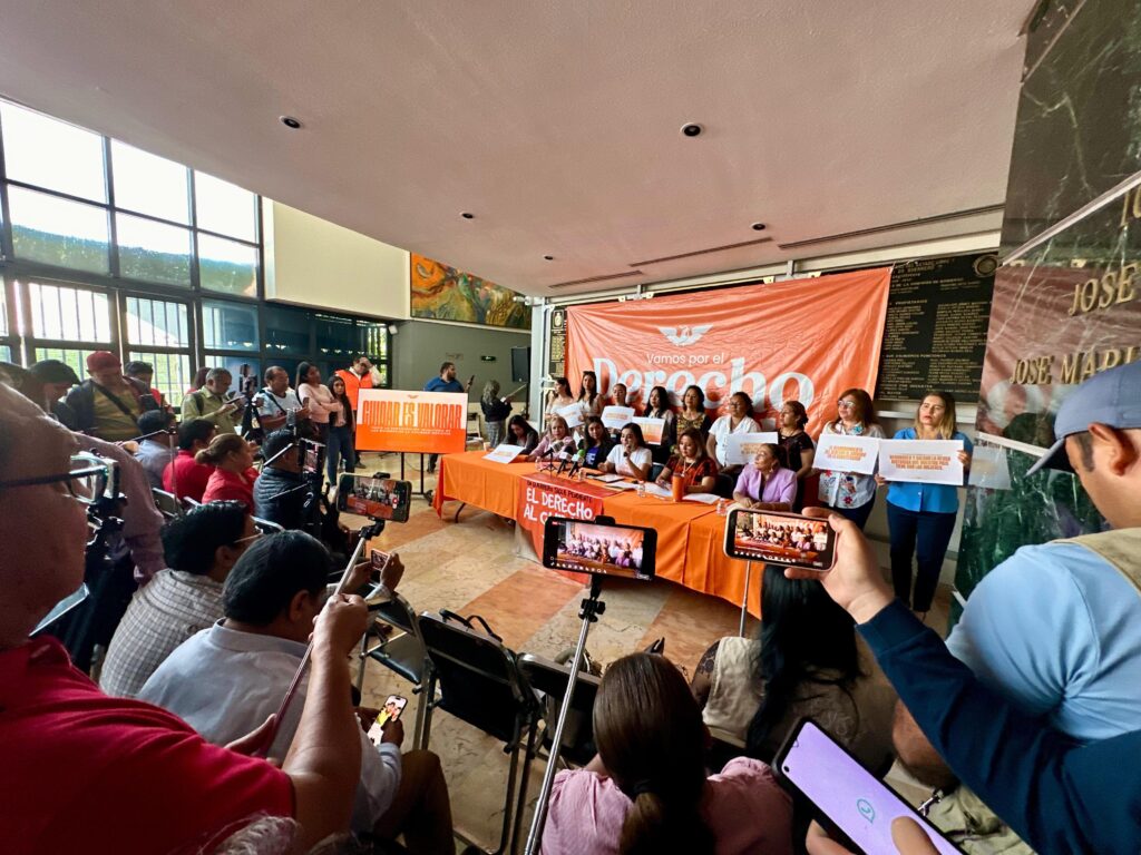 La Coordinadora Estatal, Gaby Bernal Reséndiz, realiza la presentación de la iniciativa, la Bancada Naranja, conformada por las diputadas Erika Lührs Cortés y Deyanira Uribe Cuevas.
